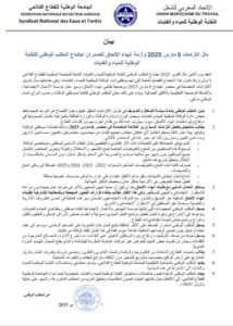 كما أكدت النقابة أنها ستواصل تتبع تنفيذ محضر 6 مارس 2025، ولن تتردد في اتخاذ الخطوات النضالية اللازمة في حال استمرار التماطل، داعية الحكومة إلى فتح حوار جدي ومسؤول يفضي إلى حلول عملية تضمن استقرار العاملين في القطاع وتطوير أدائه.