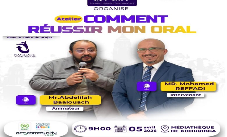في إطار مواكبة تلاميذ السنة الثانية باكالوريا في محطتهم الحاسمة، ينظم مركز” براين”، بالتنسيق مع الخزانة الوسائطية (م ش ف) بخريبكة، ورشة تدريبية تطبيقية مجانية تحت عنوان ” كيف انجح في امتحاني الشفوي”، وذلك بفضاء الخزانة يوم الأحد 5 ابريل 2026 على السعاة التاسعة صباحا.